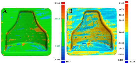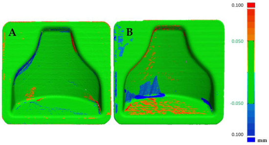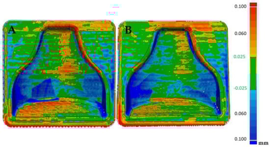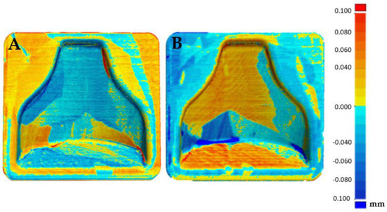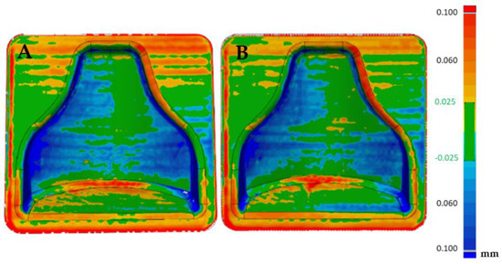 In Figure 15A the reproducibility of the process can be evaluated. In fact, it can be seen that the two post-treatment molds differed in an absolute value by less than 0.1 mm, with the likely analysis almost completely colored green. Figure 15B shows the areas that were slightly positive and those that were negative, but overall a good matching was obtained, making it possible to guarantee narrow tolerances.