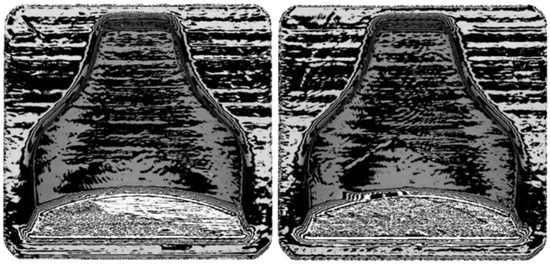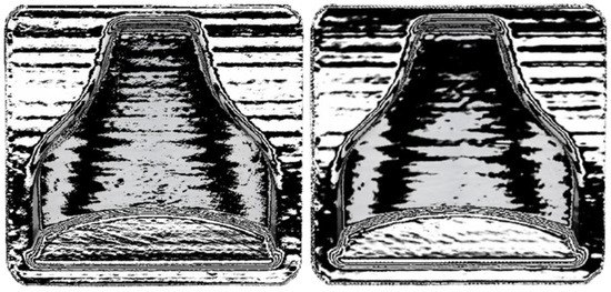 Afterwards, thanks to the Geomagic visualization tool (3d systems Inc., Valencia, CA, USA), a comparison with Figure 9 was performed in Figure 12, and it was possible to see a greater homogenization of the surfaces, which can be seen from the zebra stripes. This was due to the smoothing process that turned the surfaces smoother and glossier. Additionally, it was possible to appreciate the effect of smoothing on the dimensional variation of the component in Figure 13 and Figure 14. The molds before and after treatment were compared.