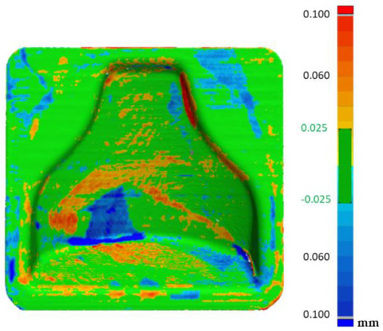 Furthermore, Figure 10 shows the comparison between the two molds point-clouds with each other. It could be seen that the reproducibility of printing with this specific material was very high. In fact, the two molds could be superimposed, as can be seen from the almost complete green color of the image.