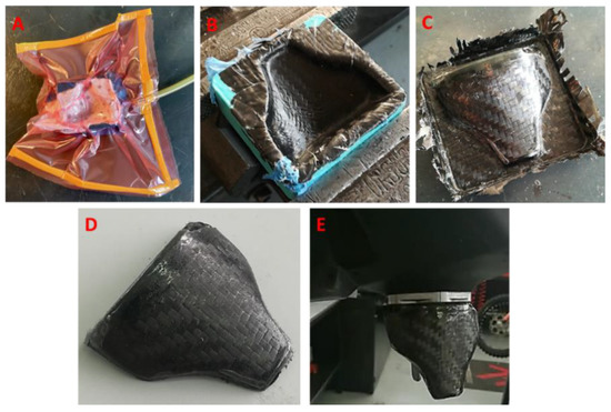 Carbon fiber component production steps: (A) component lamination and vacuum, (B) mold opened after resin curing, (C) component just extracted from the mold, (D) trimmed and finished component, (E) component mounted on the tank.