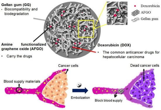 Dual-function microspheres that encapsulated a nanocarrier with an embolic agent (GG/AFGO–Dox) were developed for transcatheter arterial chemoembolization (TACE) to block nutrient delivery and enhance drug absorption, leading to tumor cell starvation and subsequent cell apoptosis (Figure 1). Many reports have highlighted the potential of graphene oxide (GO) to function as a drug carrier due to its potential π–π and hydrophobic interactions with drugs that have aromatic rings [27,28]. In addition, amine-functionalized graphene oxide (AFGO) was further modified to enhance drug hydrophilic interactions and to facilitate graphene assembly with the polymer. A GO size of between 0.5 and 25 μm enables cell membrane penetration, thereby increasing drug availability [29].