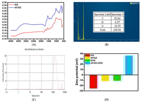 (A) FTIR spectrum of GO (red) and AFGO (blue). (B) EDS analysis of AFGO. (C) Size distribution of AFGO was evaluated using a laser diffraction particle size analyzer. (D) Zeta potentials of GO, AFGO, DOX and AFGO–DOX.