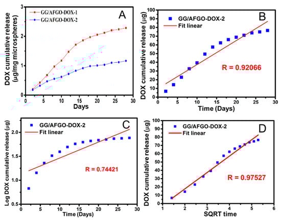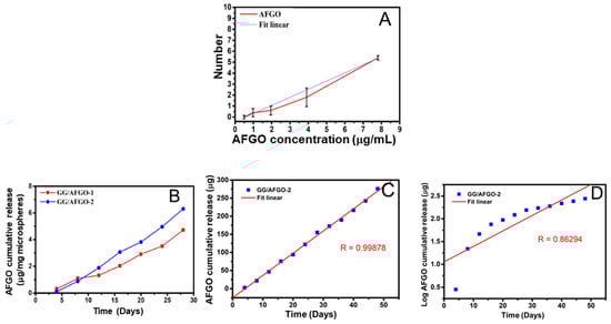 Many studies have determined the concentration of AFGO using a spectrophotometer; however, AFGO was not water-soluble in this study [34,35]. Therefore, this study determined the concentration of AFGO by using a microscope to count the number of molecules. As shown in Figure 4A, the R value of the standard curve was credible (0.99). To improve the efficiency of AFGO–Dox cancer cell entry, the release and kinetic mechanisms of AFGO encapsulated in the large (GG/AFGO–Dox-1 (674 ± 43 μm)) and small (GG/AFGO–Dox-2 (226 ± 15 μm)) microspheres were analyzed. As shown in Figure 4B, the cumulative release concentrations of GG/AFGO–Dox-1 and GG/AFGO–Dox-2 over 28 days were 4 and 6 μg/mg microspheres, respectively. The higher release concentration of the latter was due to its greater number of microspheres per unit weight. However, their release slopes were similar due to the structures of the microspheres being identical. Moreover, their release over 14 to 28 days was faster than their release over 0 to 14 days because of the slow degradation of GG.