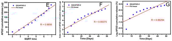 (A) Profile of AFGO release (B) Profile of AFGO release from GG/AFGO–Dox-1 (674 ± 43 μm) and GG/AFGO–Dox-2 (226 ± 15 μm) over 28 days. AFGO release according to the following kinetic models: (C) zero, (D) first, (E) Higuchi, (F) Hixson–Crowell and (G) Korsmeyer–Peppas.
