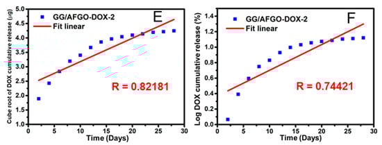 We sought to determine the effect of the microsphere diameter on Dox release using kinetic models. The cumulative release concentrations of Dox from GG/AFGO–Dox-1 and GG/AFGO–Dox-2 were 2.31 and 1.18 μg/mg microspheres, respectively, over 28 days, as shown in Figure 5A. The difference in concentration was due to the latter having a larger surface area per unit weight. Once again, five kinetic models were used to analyze Dox release from the GG/AFGO–Dox-2 microspheres: zero-order, first-order, Higuchi, Hixson–Crowell and Korsmeyer–Peppas. The R values obtained for each model were 0.9302, 0.8054, 0.9770, 0.9314 and 0.8054, respectively, as shown in Figure 5B–E. The drug release results best conformed to the Higuchi model, in which drug release is characterized by proceeding through diffusion, a structure with varying geometric shapes or matrix characteristics (e.g., porosity), and a release rate that is dependent on the material thickness [38]. These characteristics indicate that Dox was initially released from the surface and then from the inner layer, thus achieving slow release through continuous diffusion. The kinetic models of AFGO and Dox release were consistent with their encapsulation.