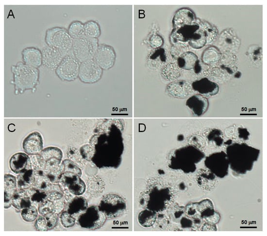 The particle size analysis of AFGO (Figure 2C) revealed that the size of graphene should enable cell membrane penetration. To verify this possibility, a time course of AFGO absorption by the HepG2 cells was investigated through microscopy analysis at 3, 9 and 24 h, as shown in Figure 6. The level of AFGO that was phagocytosed into the cell increased with time, thus showing that AFGO was able to penetrate into the HepG2 cells.