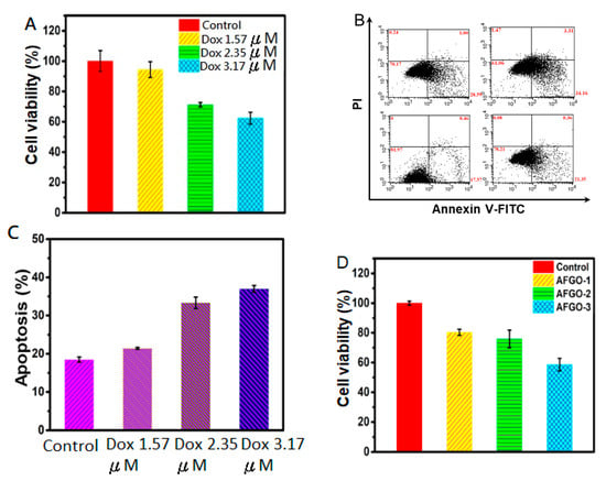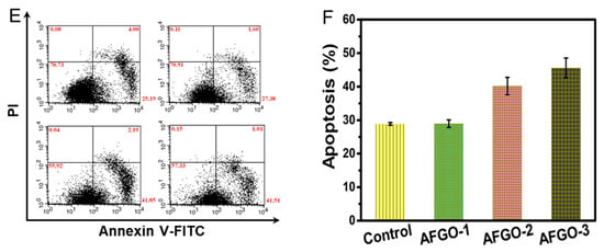 Analysis of cell viability and apoptosis by flow cytometry. (A) Cell viability of HepG2 cells after 24 h incubation in medium with 0 (control), 1.57, 2.35, 3.17 μM of DOX. (B,C) Apoptosis induced in HepG2 cells treated with different concentrations of DOX for 24 h by flow cytometry. (D) Cell viability of HepG2 cells after 24 h incubation in a medium with AFGO-1 (25 μg/mL), AFGO-2 (50 μg/mL), AFGO-3 (75 μg/mL) and without AFGO (control). (E,F) Apoptosis induced in HepG2 cells treated with AFGO-1 (25 μg/mL), AFGO-2 (50 μg/mL) and AFGO-3 (75 μg/mL) for 24 h by flow cytometry. Two-tailed Student’s test was used.