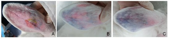 To evaluate the embolization efficiency of GG/AFGO–Dox (226 μm) in vivo, we used a rabbit ear model that had been established in our previous study [22]. As shown in Figure 8, following the injection of GG/AFGO–Dox microspheres, the central auricular artery and its branches were visible in the ear (Figure 8A, day 0). Six days after embolization (Figure 8B), the blood flow at the tip of the ear was blocked. In addition, there was no obvious edema or inflammation, thus confirming the good biocompatibility of GG/AFGO–Dox microspheres. Twelve days after embolization (Figure 8C), the branches of the artery between the injection site and the tip of the ear were occluded, resulting in ischemic necrosis. These results indicate that the GG/AFGO–Dox microspheres successfully achieved embolization.
