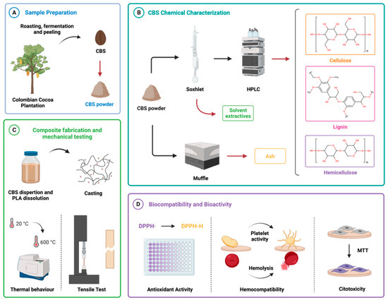 Figure 1. Workflow for the study of cocoa bean shells (CBSs) as filler of poly(lactic acid) (PLA) in biomaterial development. (A) CBSs collected after fermentation, roasting, and peeling of the cocoa bean from the Andean region of Colombia were processed by autoclaving, drying, and cryogenic grinding. (B) Chemical characterization by extraction and combustion was made to determine the chemical components of CBS. (C) Proof-of-concept for the fabrication, tensile, and thermal testing of PLA/CBS composites produced 2.5 wt.% CBS. (D) Preliminary biocompatibility assessment of CBS and PLA/CBS composites via DPPH radical scavenging activity, hemocompatibility (hemolysis and platelet activity), and cytotoxicity assays. Created with BioRender.com.