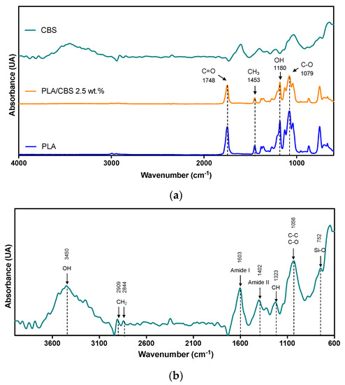 Figure 2. (a) FTIR spectra of CBS fiber, neat PLA, and PLA/CBS 2.5 wt.% measured in frequency a range between 4000 and 600 cm−1. Arrows highlight representative peaks for amorphous PLA in 1748, 1453, 1180, and 1079 cm−1 present in all samples. (b) Magnification of CBS FTIR spectra from 4000 to 600 cm−1, with arrows at peaks attributed to main constituents of the fiber (cellulose, hemicellulose, and lignin).