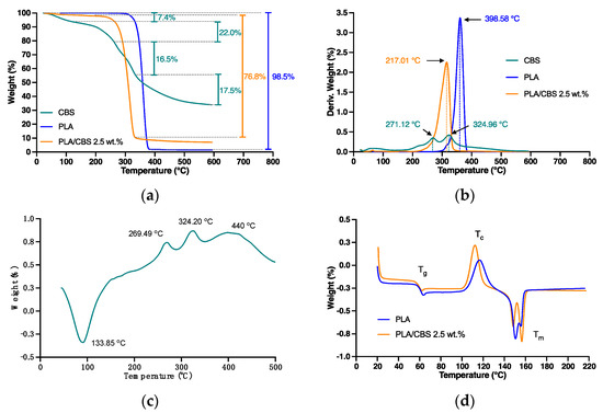 Figure 3. Thermal characterization of CBS, PLA, and PLA/CBS composites. (a) TGA analyses of CBS, PLA, and PLA/CBS 2.5 wt.% composite. Weight-loss percentage is presented in each case. (b) DTGA curves of CBS, PLA, and PLA/CBS 2.5 wt.%. The main degradation peaks of CBS and PLA are indicated in the thermogram. (c) DSC curve of CBS. Major endothermic and exothermic peaks are indicated in the thermogram. (d) DSC analyses of PLA/CBS 2.5 wt.% composite. Glass transition (Tg), crystallization (Tc), fusion (Tm), and temperatures are indicated in the thermogram.
