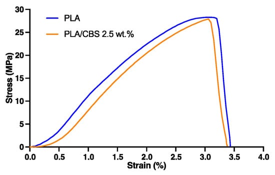 Figure 4. Representative stress–strain tensile curves of PLA and PLA/CBS 2.5 wt.% composite.