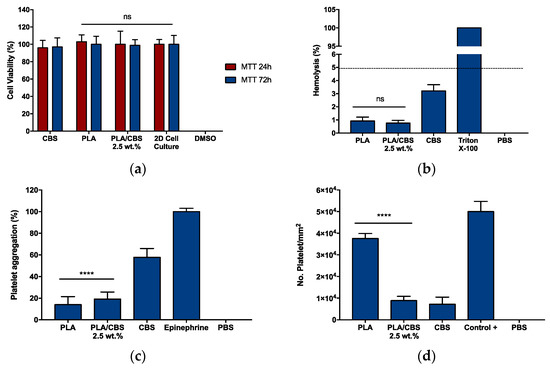 Platelet aggregation induced the by CBS, PLA, and PLA/CBS 2.5 wt.% composites was tested by the precipitation of platelets isolated from a human blood sample of a healthy donor collected in a vacutainer tube with 3.2% sodium citrate [12]. The sample was centrifugated at 1000 RPM for 15 min to obtain platelet-rich plasma (PRP). A sample of 100 μL of PRP was placed on a microplate and allowed to have contact for 3 min with square samples (3 mm × 3 mm). The positive control was 70 μL of PRP and 30 μL of epinephrine, while the negative was 70 μL of PRP and PBS (1X). Finally, 50 μL of each supernatant was transferred to a 96-well microplate, and the absorbance was read at 620 nm in a microplate spectrophotometer. A total of five samples were tested.