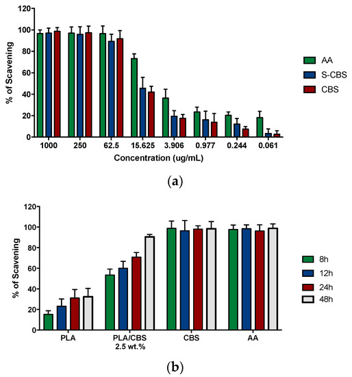 In addition, the PLA and PLA/CBS 2.5 wt.% composite’s antioxidant activity was evaluated by exposing five square samples (3 mm × 3 mm) to 300 µL of methanol for 8, 12, 24, and 48 h, at 37 °C, under continuous agitation. After incubation, 100 µL of each medium was transferred to a new 96-well microplate and exposed to 0.2 mM methanolic DPPH solution, as described previously.