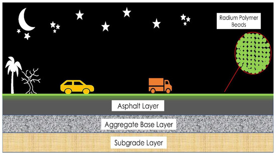 The utilization of luminescent materials on the surface of roadways is gaining popularity around the globe as shown in Figure 2. Roadways that glow in the dark, like a starry night, are not only attractive but also environmentally friendly. Luminescent materials can be utilized instead of expensive, energy-guzzling lights to brighten up driveways and sidewalks. For example, utilization of CORE Glow products, which are photo-luminescent stones that absorb light from the sun throughout the day and gradually emit their light at nighttime for up to 12 h. This product is available on the market in the form of recycled glass, marble, and plastic pebbles. Glittering pebbles, which are constructed of photo-luminescent pigment or resin, are also another readily available solution. Similarly, spray paint is also available and can be used to construct glow in the dark roadways made up of large stones. It can also be used for marking roadways or highways. During the construction of new roadways made from concrete, different pigments in combination with concrete materials can be added to provide an overall glow in the night.