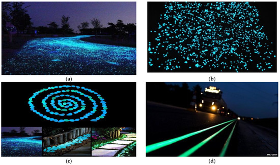 Different products used to illuminate the roadway at night [18]: (a) Luminescent product; (b) Core Glow products; (c) Unime pebbles; (d) photo-luminescent paint.