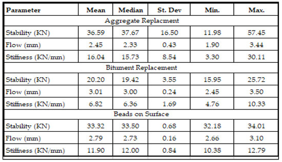 All the properties of modified asphalt mixtures were statistically analyzed such as Marshall stability, Flow, Indirect tensile strength (ITS), and Stiffness. The Excel statistical program was used to determine the data description of stability, flow, and other characteristics of the modified and unmodified core samples. The results of the data analysis which included descriptive data analysis, mean, mode, median, variance, and standard deviation are summarized as shown in Figure 6.