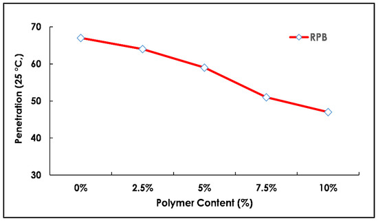 A penetration test refers to the measurement of standard consistency of asphalt binder in which a standard needle penetrates the specimen. The penetration test was conducted for both types of bitumen (modified and unmodified). The penetration results are presented in Figure 7. According to laboratory results, a decrease in the penetration reading was observed with increasing radium polymer content. During the blending process, it was noticed that modified bitumen was not completely homogenous, as the radium polymer material could not be mixed properly within a pure binder and remain suspended at the top layer which might change the results. The penetration test was performed after the milling of the top surface and results are displayed in Figure 7. Moreover, it was observed that the average penetration values fall with an increase in polymer contents of up to 10%. This might have happened due to strong adhesive bonding between the modifier and binder. Therefore, polymer modified binder is recommended in hot regions because in such regions low penetration values were ideal to avoid softening of the binder. In conclusion, it is recommended to practice in hot climate zones and where there is a heavy traffic load.
