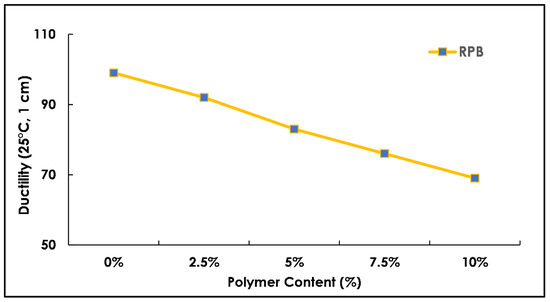 The ductility test was conducted as per ASTM standard. In this test, the binder was elongated at a speed of 5 cm/min at a testing temperature of 25 °C. The breaking of the specimen was recorded and called ductile value. The ductility results of both modified and unmodified bitumen are presented in Figure 8. It was observed that the ductility reading decreases with an increase in polymer content at varying percentages of 0–10%. The standard limit of the ductility value was >75. The decrease in ductility values may be due to weak bonding between the aggregate and binder. The ductility property is also the result of the binder performance and if a physically harder material is mixed with a binder-like bitumen it reduces its ductility property, which is why a low percentage of modification is recommended, which creates a control on ductile behavior. During the continuous loading condition, if a material does not show ductility, it tends to break within a certain limit due to the repetition of loads. In the case of road material, a ductile material is recommended, and modification of bitumen is also recommended up to a certain limit.