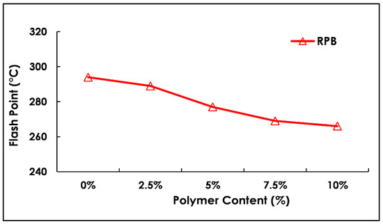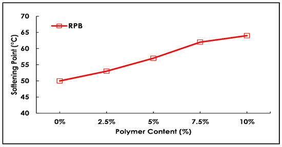 The properties of the pure and modified binder with radium polymer materials were comprehensively studied for an in-depth analysis of the results as shown in Figure 7 and Figure 8. Four basic tests of the conventional binder such as softening point (°C), flash point (°C), ductility (@ 25 °C), and penetration tests (0.1 mm) were conducted. The test methods used in this study were all standard for measuring the effects of radium polymer addition in the pure binder. The results of polymer-modified bitumen were then compared with unmodified (reference) bitumen for a better understanding of binder behavior upon polymer addition. Five different percentages of radium polymer materials 0–10% were selected and replaced binder 60–70 by weight of total optimum binder content, which was 7% in this study.