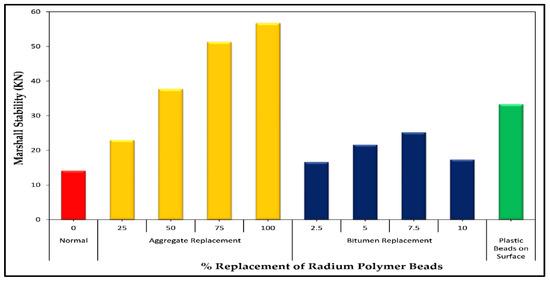 On the other hand, the aggregate of #4 sieve was also replaced with four different percentages of a radium polymer material such as 0%, 25%, 50%, and 100%. The Marshall stability was checked for each percentage. It is clear from Figure 11 that the stability of polymer asphalt mixtures was enhanced with the addition of polymer as an aggregate replacement.