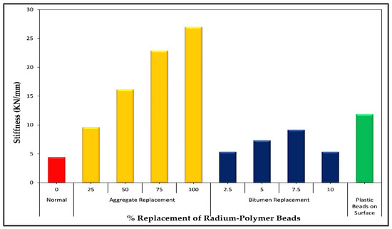 The increase in stiffness values was recorded in the case of polymer addition for each percentage of aggregate replacement with sieve #4. The addition of polymer-modified mixtures had higher stiffness values which indicated more resistance against permanent deformation [55]. The mean stiffness value for control samples was 9.63 (KN/mm). The radium polymer beads increased the stiffness values at 25%, 50%, 75% and 100% replacement of sieve #4 aggregates by 54%, 40.57%, 57.97% and 64.36%, respectively. Similarly, increased stiffness values were observed when polymer beads were placed on the surface of asphalt mixtures, which was 62.78% stiffer as compared to control asphalt mixtures.