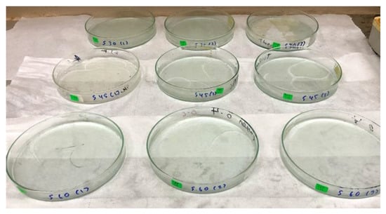 Cornstarch films are also made utilizing the same formulation process, in which the plasticizer needs to be injected into suspensions of polysaccharides through a certain amount of cornstarch [,]. The solution is continuously mixed for a while with a magnetic agitator to achieve an acceptable dispersion. The ideal plasticizer is then poured into a polysaccharide blend with a specified weight/weight ratio. The suspension is then positioned in a water tank through a magnetic agitator at the appropriate temperature and period. The standard suspension is then filled in a petri dish as shown in Figure 1. The dishes are first dried into the air circulation oven. The dry film is then separated into rectangular sections and treated before atmospheric characterization processes [,,,,,,].