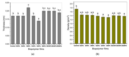 (a) Thickness and (b) density of cornstarch biopolymer films. a,b,c Values with different letters in the figures are significantly different (p < 0.05).