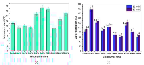 (a) Moisture content and (b) water absorption of cornstarch biopolymer films. a,b,c,d Values with different letters in the figures are significantly different (p < 0.05).