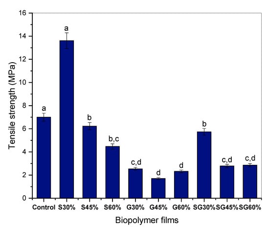 Tensile strength of the cornstarch-based film with different plasticizers. a,b,c Values with different letters in the figures are significantly different (p < 0.05).