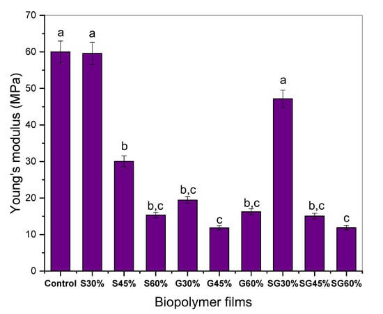 Young’s modulus of the cornstarch-based film with different plasticizers. a,b,c Values with different letters in the figures are significantly different (p < 0.05).