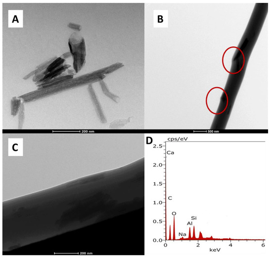 Figure 2A represents the transmission electron microscope image of the halloysite clay nanotube. The tubular nature of the nanoclay is clearly revealed from the image, indicating a cylindrical shape and open-ended lumen. The average outer diameter for the nanoclay was found to be 45–90 nm with an inner lumen diameter of 10–20 nm with a corresponding wall thickness of around 25 nm. To confirm the presence and dispersion of halloysite inside the polymer fiber, a transmission electron microscope image of the single composite fiber was taken. From Figure 2B,C, it is clear that tubular shaped halloysite nanoclay in a well-dispersed form is present inside the polymer electrospun fiber. From the TEM image, it is visible that the tubular structure of the clay causes some projection, such as uneven formations on the surface of fiber, which might also contribute to the resulting surface roughness of the composite fiber. The addition of HNTs causes an increase in surface roughness, which was confirmed from the profilometer study results (Section 3.2). Tthe presence of halloysite nanotubes in the fiber is again confirmed from the electron dispersive spectrum (EDX) data, which is shown in Figure 2D.