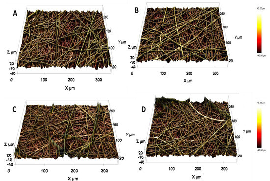 The 3D surface morphology of the prepared fibers was analyzed, using an optical surface metrology system; the images are shown in Figure 3. The non-destructive confocal scanning images also give information on the surface roughness represented by Sa (arithmetic mean height). The minimum Sa value was found to be 3.4 µm for the neat COPA, while the COHA1.5 showed a Sa value of 6.6 µm. From the 3D images, it is again clear that the fibers were homogenous with no beads and exhibited a regular appearance.