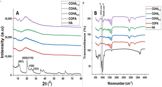 Figure 4A represents the FTIR spectra of the as-synthesized COHA composite nanofibers. In the case of copolyamide, the peak at 3288 cm−1 represents the N–H stretching vibration. Two peaks at 2923 cm−1 and 2854 cm−1 represent the asymmetric –CH2 stretching and symmetric –CH2 stretching, respectively [32]. The band at 1637 cm−1 represents the –C=O stretching vibration. A sharp band at 1549 cm−1 represents the –NH bending vibration. The absorption bands at 3695 cm−1 and 3620 cm−1 present in the halloysite clay were assigned to the stretching vibration of the -OH groups at the inner surface of halloysite [33]. These bands were not prominently seen in the composite, which may be due to the fact that the surface of the HA is completely covered by the polymer. Two prominent bands present in the HA, 912 cm−1, which is due to the vibrations of the inner surface hydroxyl group and 1030 cm−1 due to the stretching vibrations of Si–O–Si, was not significant when the percentage of HA was small in the composite membrane. As the amount of HA increases, these peaks begin to appear in the spectrum, thereby confirming the presence of HA inside the composite membrane.