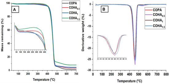 (A) TGA and (B) DTA curves of neat copolymer and COHA polymer nanocomposites.