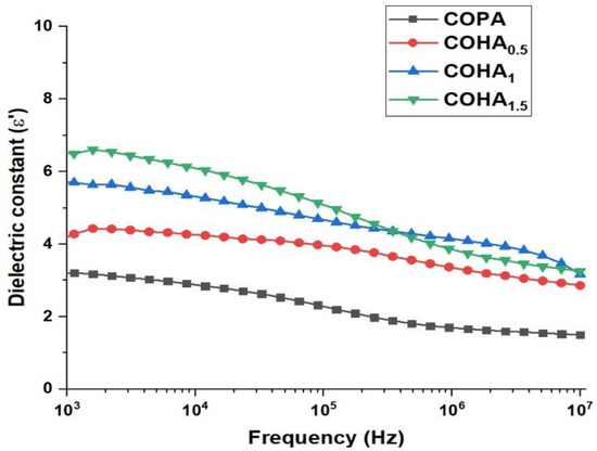 The frequency-dependent dielectric constant of the as-prepared neat COPA and COHA composite nanofibers with various filler content are studied over a frequency range of 102 to 106 and the results are shown in Figure 6. With the addition of HA to the neat COPA, the dielectric constant of the composite increases as expected [38]. This can be attributed to the polar nature of the HA, thereby increasing the number of charge carriers in the copolyamide matrix [39]. Additionally, it is noteworthy that, even after the addition of a small percentage of filler, i.e., 1.5%, the dielectric constant of the COHA reached up to 6.5 from 3.2 for that of neat COPA at 100 Hz. Meanwhile, the dielectric constant of all the samples tested shows a decreasing trend, while increasing the frequency. This can be due to the fact that the interfacial dipoles fail to orient themselves along the applied field direction, resulting in a decrease in the interfacial polarization, eventually leading to a decreased dielectric constant [40].
