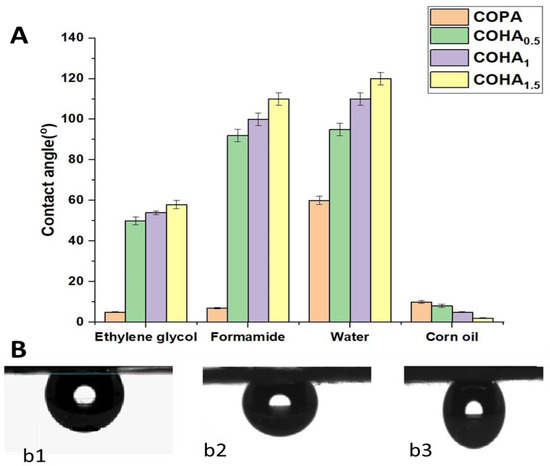 Figure 7A represents the contact angle measurements for various solvents on the neat COPA membrane and various composite COHA membranes. Due to the presence of –CO and –NH functional groups on its skeletal structure, electrospun COPA is generally classified as a hydrophilic polymer. It is to be noted that the contact angle of a liquid on a material surface depends on many factors, including the surface roughness, nature of material, morphology of the material, surrounding atmosphere, etc. As per the Cassie model, the surface roughness is inversely related to wettability, which means that as the surface roughness increases, the wettability decreases, thereby increasing the contact angle values [41]. The average contact angle of ethylene glycol, formamide, water and corn oil in air for neat COPA membrane is 5°, 7°, 60° and 10°, respectively. Meanwhile, adding the tubular nanoclay to the fiber causes variation of the surface properties, thereby affecting the contact angle values for different solvents. For COHA1.5, the average contact angle of ethylene glycol, formamide, water and corn oil in air is found to be 58°, 110°, 120° and 2°, respectively.