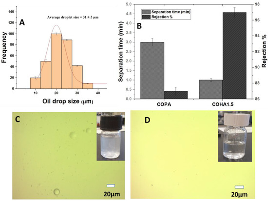 The as-prepared electrospun nanocomposite mats were tested for separation of oil from an oil/water emulsion. A total of 100 ppm vegetable oil in water was used for the study and the emulsion was filtered through the membrane under pressure. The filtrate was subjected to UV visible spectroscopic analysis and by comparing with the calibration curve, the ratio of oil present in the filtrate was deduced. Compared to the neat COPA membrane, COHA1.5 has a lower separation time that is almost more than two times faster with better oil rejection properties. It was found that the neat COPA electrospun mats were able to separate 87 wt% of oil, whereas the COHA1.5 composite electrospun fiber membrane showed improved oil retention capacity and removed 97 wt% of the oil (Figure 8A. The water permeation capability of the neat COPA membrane was found to be 2087 L/m2 h, whereas that of the COHA1.5 was 6265 L/m2 h, which is higher compared to the other halloysite-based composites reported [28,29]. The optical microscopy image of the 100 ppm oil/water emulsion and the permeate after filtration is shown in Figure 8C,D, respectively. It can be seen that after the filtration, the oil droplets in the water are not visible in the image, which indicates the removal of oil droplets. Hence, by controlling the surface roughness, the directional transport of water can be modulated and hence, more efficient emulsion separation can be achieved.