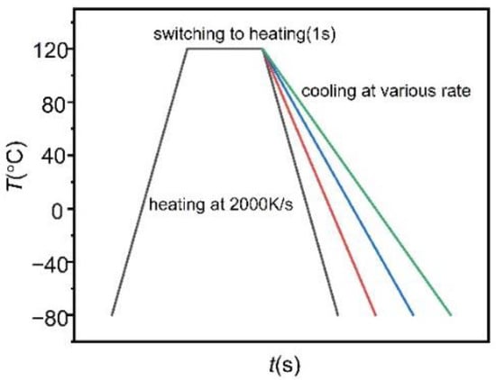 The non-isothermal crystallization was performed as follows: the samples were heated up to 120 °C higher than the melting point of the samples at a heating rate of 2000 K/s, this temperature was maintained for 1 s to obtain the equilibrium of the melt. Then the samples were cooled to −80 °C at different cooling rates, which is lower than its glass transition temperature. The temperature program is shown in Figure 1.