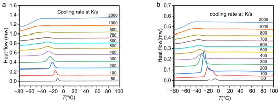 Figure 2 plots the cooling curves of PEG and PEG-PCL under various cooling rates measured by FDSC. In Figure 2a, an obvious crystallization peak can be observed when the cooling rate is low. The crystallization exothermic peak of PEG becomes broad and weak when the cooling rate reaches 800 K/s. PEG is completely inhibited from crystallization when the cooling rate exceeds 1000 K/s. In Figure 2b, double crystallization peaks appear on the cooling curve of PEG-PCL when the cooling rate is 50 K/s, and 100 K/s, which shows that both the PEG block and the PCL block can crystallize when the cooling rate is low. This is similar to the results measured by Hiroki et al. using DSC; they found that PCL crystallized first, followed by the crystallization of PEG with preservation of the PCL crystal lamellar structure [29]. However, the double crystallization peak becomes a single peak when the cooling rate reaches 200 K/s. The crystallization peak of PEG-PCL disappears when the cooling rate continues to increase to 1000 K/s.