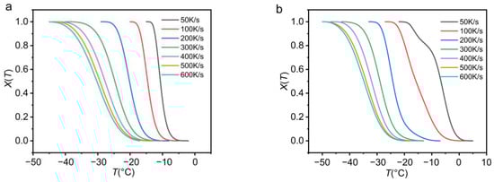 Figure 3a is the curve of relative crystallinity with temperature in the crystallization process of PEG. The relative crystallinity and the crystallization temperature are obviously reverse S-shaped. Figure 3b is the curve of relative crystallinity with the temperature during the crystallization of PEG-PCL. The curve is not an obvious reverse s-shaped curve when the heating rate is 50 K/s. The reason is that the PEG block and PCL block of PEG-PCL crystallize at different temperatures. Therefore, the peak splitting behavior on the crystallization curve is obvious.