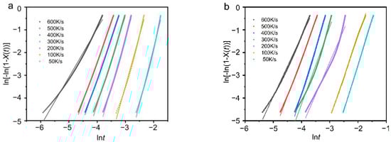 (a) PEG and (b) PEG-PCL non-isothermal crystallization ln[−ln(1−X(t))] plotting lnt.