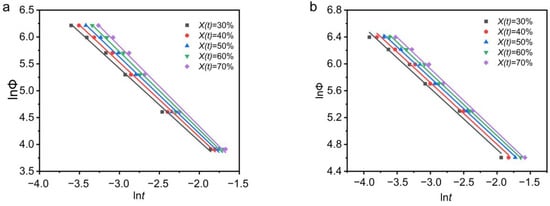 According to the analysis of the Ozawa model, the graph of ln[−ln(1 − X(T))] versus lnΦ should show a linear relationship, with a slope exponent of m and an intercept of lnk0(T). At different temperatures T, the relationship between ln[−ln(1 − X(T))] and lnΦ analyzed by the Ozawa model is shown in Figure 4. It can be seen from Figure 4 that the Ozawa model fits the experimental data very well.