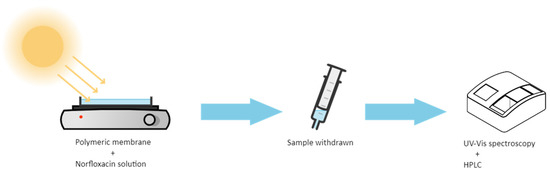 The Ag@TiO2/PVDF-HFP nanocomposite membranes (16 cm × 16 cm × 150 µm) were placed at the bottom of a glass Petri dish with a 250 mL capacity volume. For the photocatalytic assays, 150 mL of MNZ standard solution was poured in the dark into the glass Petri dish containing the membranes at the bottom and stirred for 30 min. After that, the glass Petri dish was placed under magnetic agitation and sunlight irradiation for 5 h, and 3 mL aliquots were withdrawn hourly. Besides the degradation under sunlight irradiation, the photocatalytic degradation of MNZ was also studied by artificial UV irradiation (PHILPS PL-L 24W/10/4P UV lamps, λmax = 365 nm and I = 18.6 W/m2). The schematic illustration of the photocatalytic assays setup is presented in Figure 1.