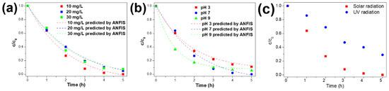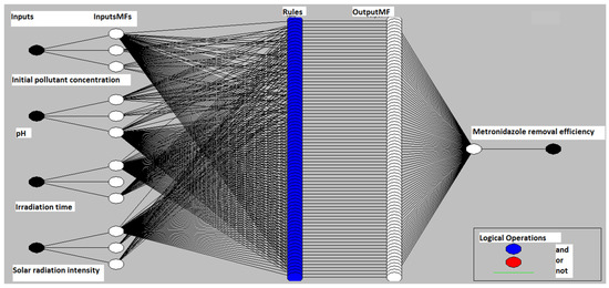 As the photocatalytic process is somewhat affected by different parameters, simulating and modelling based on conventional mathematical approaches are quite complicated [36]. In this context, an adaptive neuro-fuzzy inference system (ANFIS) allows for the prediction of water quality parameters, as has been previously demonstrated [37,38]. Additionally, the application of an ANFIS model has been reported to evaluate wastewater treatment processes, namely in the elimination of organic dyes [39,40], oily wastewater [41], chemical additives [36], antibiotics [42] and heavy metals [43,44].