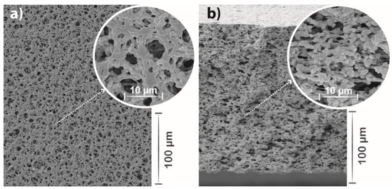 Morphological characterisation of the pure and nanocomposite membranes was assessed by scanning electron microscopy (SEM, NanoSEM e FEI Nova 200 (FEG/SEM), Lincoln, NE, USA) with an accelerating voltage of 10 kV. All samples were coated with a 20-nm-thick gold layer by magnetron sputtering with a Polaron SC502 apparatus.