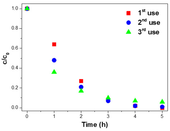 Photocatalytic degradation of MNZ (10 mg/L) with 10% Ag@TiO2/PVDF–HFP membranes in three consecutive uses, under 5 h of sunlight exposure in each experiment.