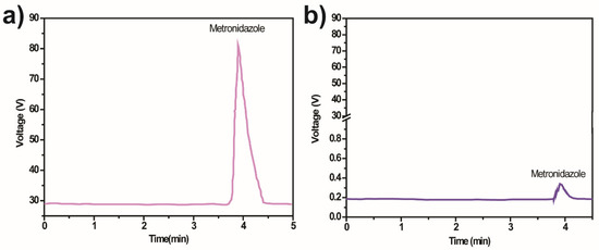HPLC chromatogram of MNZ (Ci =10 mg/L) samples (a) before and (b) after photocatalytic degradation by 10% Ag@TiO2/PVDF-HFP under 5 h of sunlight irradiation.