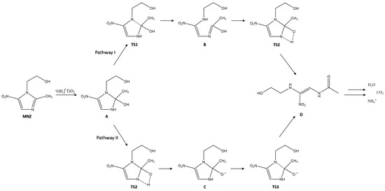 According to previous work [78], the degradation mechanism of MNZ begins with the adsorption of this molecule to the Ag@TiO2 surface. A H atom on the branch of the imidazole ring and the metronidazole methyl group can form hydrogen bonds to the O atoms of Ag@TiO2 [47]. Additionally, both hydroxyl and nitro O atoms of MNZ can adsorb on the nanocomposite Ti atom [79]. Electrons and holes are excited when photons irradiate the Ag@TiO2 surface with energy higher than the bandgap energy, and OH radicals are formed to degrade the MNZ molecule [80]. The opening of the imidazole ring is the fundamental step of this antibiotic degradation. Two possible mechanisms for this step are presented in Figure 9.