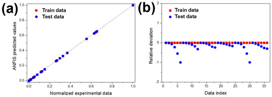 The predictability of MNZ degradation was investigated by using the developed ANFIS model. In determining the ANFIS model’s inputs, the MNZ degradation efficiency was directly related to experimental parameters such as initial contaminant concentration and pH. For both experimental conditions, three data points were used, and experimental results were used to train the ANFIS model. Figure 10 shows the ANFIS-predicted results against normalised experimental data for train and test values.